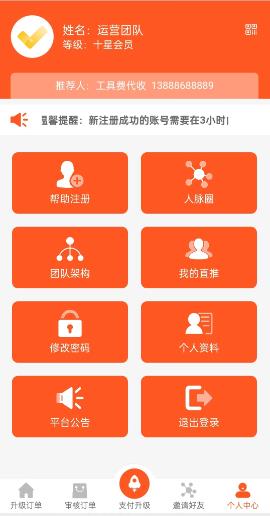 系统没有充值入口,没有提现通道,没有资金池,平台除了工具费和升级费用,没有额外收任何会员一分钱,平台24h为会员服务,是各位会员、人脉和财富完美的匹配工具!